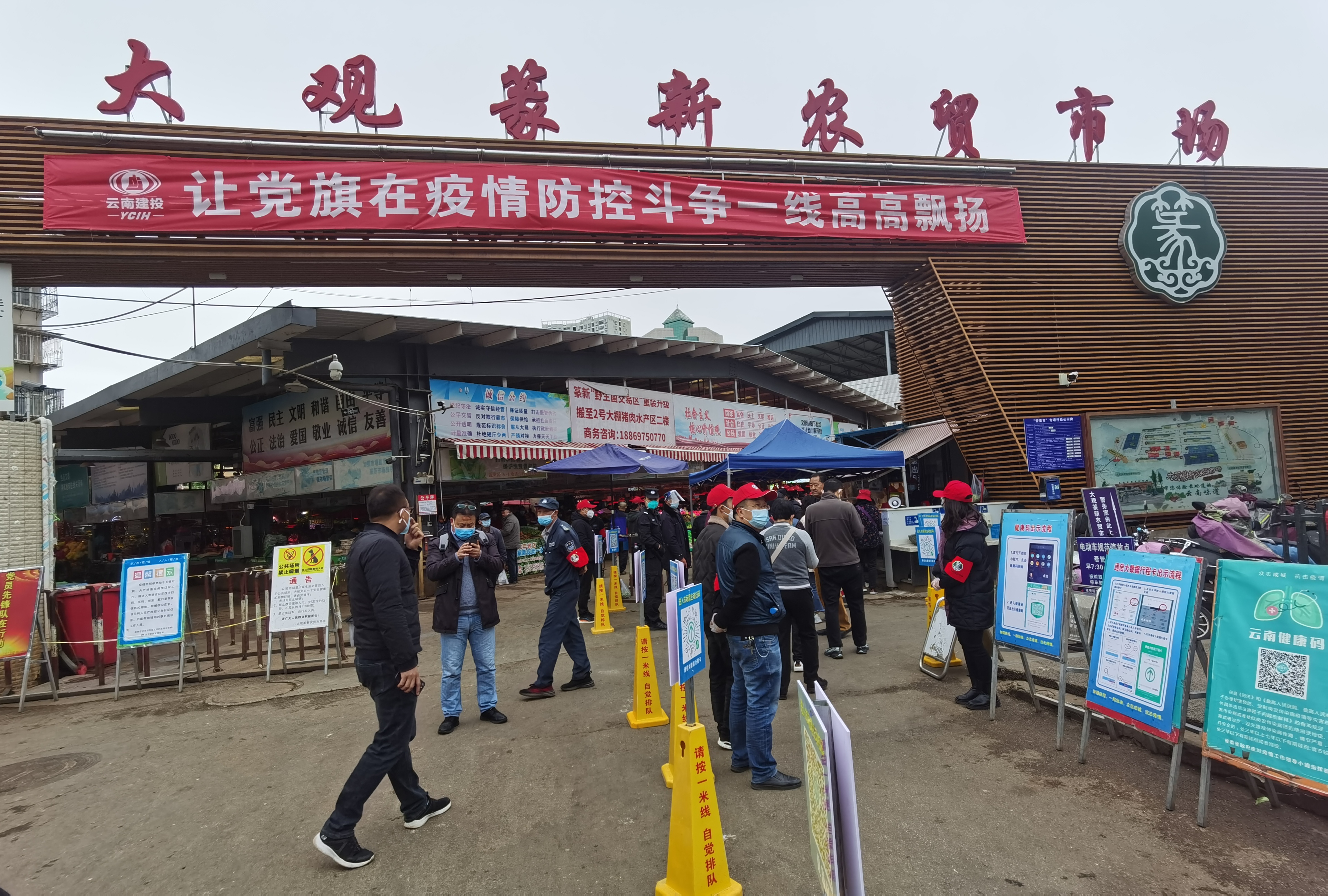 公司黨委結合市場實際情況,將黨員先鋒隊劃分為6個小組,每組10人,在劃分進出通道的基礎上,于入口處拉好警戒線設立三或四個通道,會同原有的市場安保和管理人員,分段式檢查所有進入市場的人員的健康碼和行程碼,行程碼帶星號、健康碼非綠色的人員一律禁止進入市場,對沒有手機的人員進行登記,并確保身份證號等相關信息齊全方可允許進入市場。