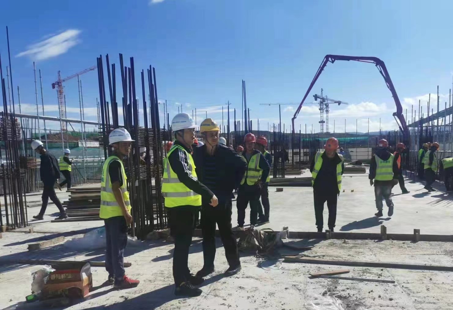 第三項目經理部一行對施工現場總平面布置、安全文明施工等進行參觀。現場垂直運輸設備、材料堆場、加工場及臨時道路布置合理,施工現場干凈整潔。