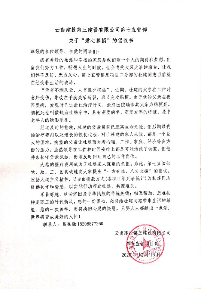 據悉,第七直管部鎮果項目二分部的橋梁施工員杜建同志,其父親在工作時意外受傷,導致左手腕關節斷裂,后又突發腦梗死(缺血性腦卒)。經過及時搶救雖已脫離生命危險,但病情還在持續加重,后期昂貴的治療費對于杜建的家人來說,是一個巨大的困難。面對病重的父親,杜建承受著心理、工作、家庭、經濟等多方面的壓力。第七直管項目部向全體職工發出“愛心捐款倡議書”,得到了全體干部職工的極大響應,紛紛伸出援助之手,共克難關。目前,“愛心款”已送到杜建同志手中。