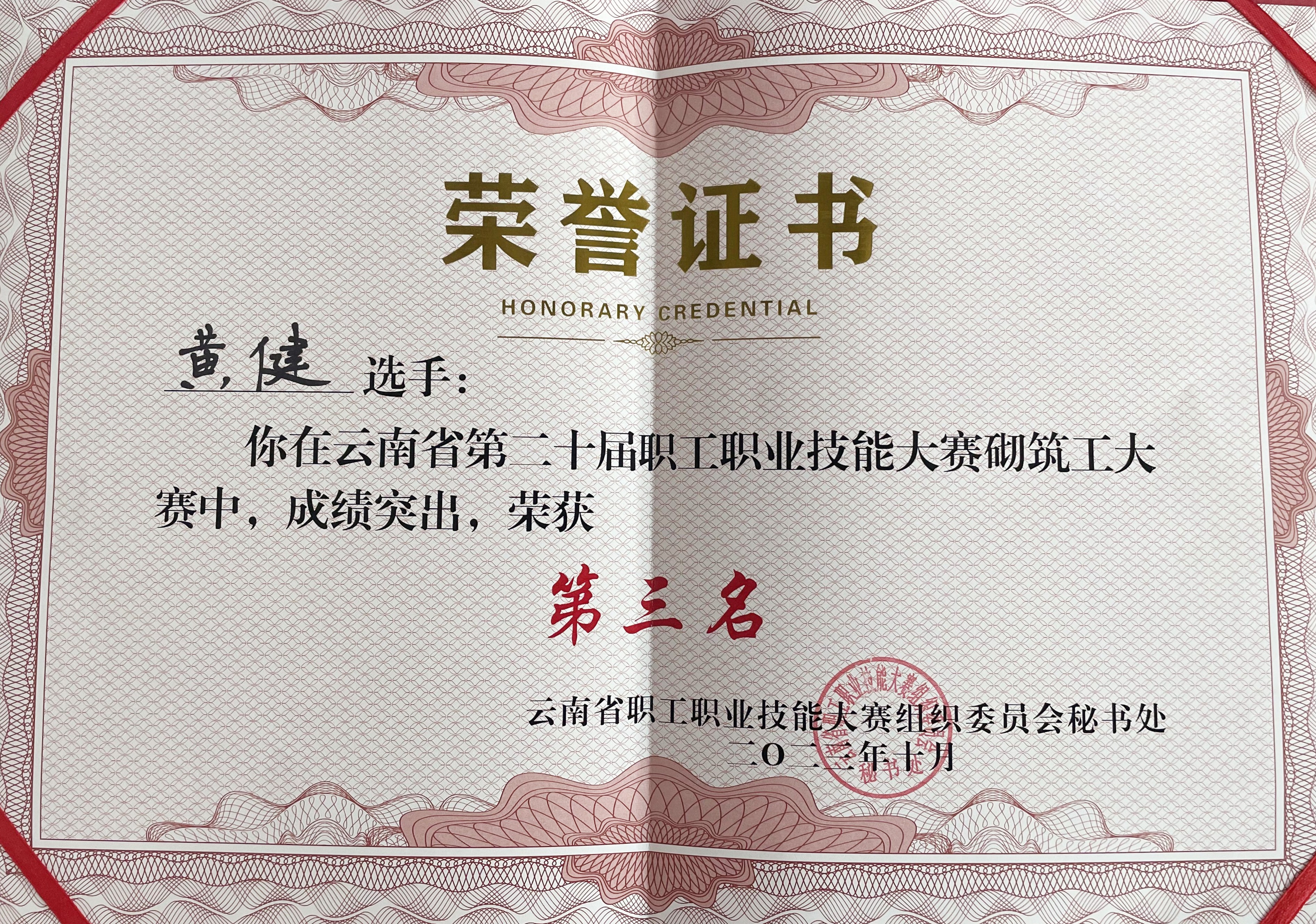 近日,云南省第二十屆職工職業(yè)技能大賽砌筑工大賽圓滿落下帷幕,公司第十七直管項(xiàng)目部農(nóng)民工黃健榮獲大賽第三名。
