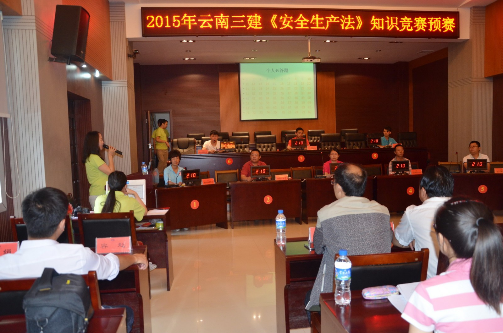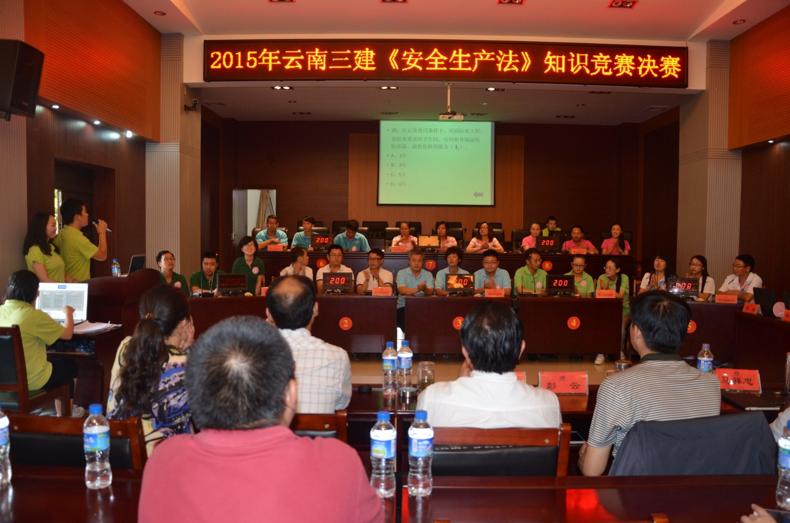 這是6月27日公司工會舉辦2015年《安全生產法》知識競賽現場。公司在昆班子成員10名領導觀摩整場比賽,公司所屬各單位組成的23支代表隊參與比賽,公司200余名職工參與本次活動。經上午的預賽角逐后,下午由預賽產生的前八強進入決賽。整場比賽扣人心弦。比賽中,各隊沉著應對、競爭激烈,凸顯了各方實力。機關代表隊在搶答環節表現出色一路領先。到風險奪分題環節,第二水電項目部代表隊、路橋市政直管部代表隊再次以50分的高難度題目完美掰平機關代表隊,場上三支隊伍再度進入搶答題加賽環節,以決出前三名。比賽再次懸念疊起,場上三支隊伍,比記憶、比技術、比心態,最終,第二水電項目部代表隊拔得頭籌,路橋市政直管部代表隊奪得第二名。機關代表隊,三名女將,巾幗不讓須眉,成為本次比賽的黑馬,奪得第三名。第三項目部、第六直管部、第八直管部三支代表隊進入前六名獲三等獎。
