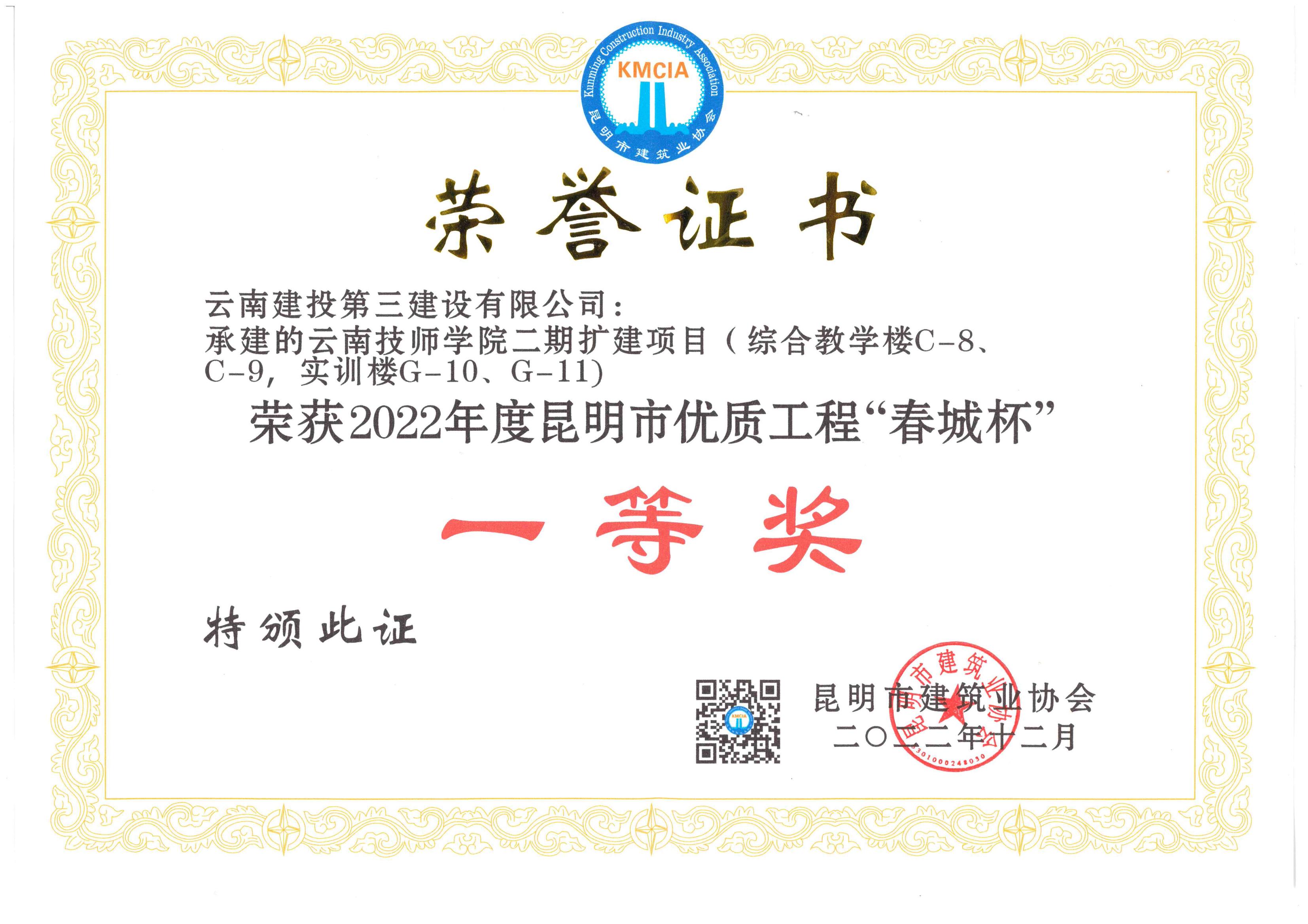 此外,公司第十九直管部承建的云南技師學(xué)院二期擴(kuò)建項(xiàng)目(綜合樓C-8、C-9,實(shí)訓(xùn)樓G-10、G-11)榮獲2022年度昆明市優(yōu)質(zhì)工程“春城杯”一等獎(jiǎng);公司第十二直管部承建的云谷小區(qū)(6號(hào)地塊)一期二標(biāo)段、第十直管部承建的空港C片區(qū)(C-2地塊)二標(biāo)段榮獲2022年度昆明市優(yōu)質(zhì)工程“春城杯”二等獎(jiǎng);另獲評(píng)優(yōu)秀項(xiàng)目經(jīng)理、優(yōu)秀項(xiàng)目總工各3人,獲評(píng)“突出貢獻(xiàn)者”11人。