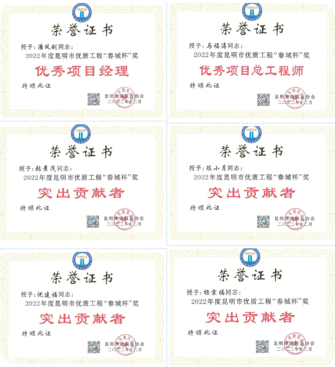 公司被評(píng)為2022年度昆明市建筑業(yè)“先進(jìn)企業(yè)”和“質(zhì)量管理優(yōu)秀企業(yè)”,公司黨委書記、董事長(zhǎng)彭云被評(píng)為2022年度昆明市建筑業(yè)“優(yōu)秀企業(yè)家”,公司技術(shù)質(zhì)量管理部沈雁波、朱家虎被評(píng)為2022年度昆明市工程建設(shè)行業(yè)“優(yōu)秀工作者”。公司已連續(xù)五年被評(píng)為昆明市建筑業(yè)“先進(jìn)企業(yè)”和“質(zhì)量管理優(yōu)秀企業(yè)”。