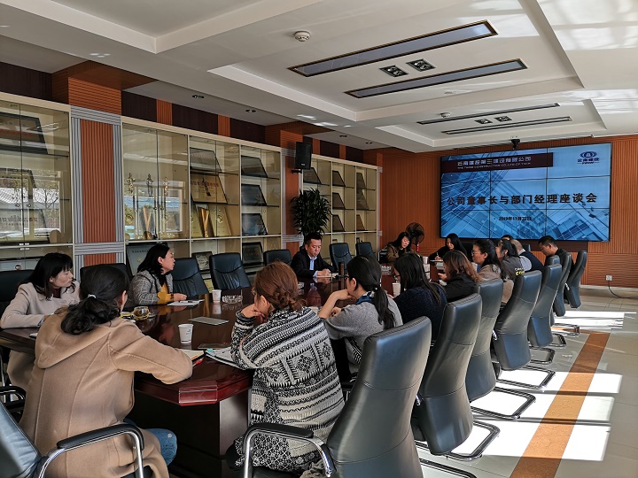11月22日下午,公司黨委書記、董事長吳勇在公司小會議室主持召開與機關部門經理的座談會。座談會上,吳勇首先對2019年機關各部門的工作給予了肯定,感謝大家在一年中所做出的成績和努力。隨后就大家關心的薪酬制度、履職待遇、辦公環境等民生問題進行了座談,同時聽取了各部門的工作想法和建議。吳勇在充分肯定機關部門工作的同時對20...